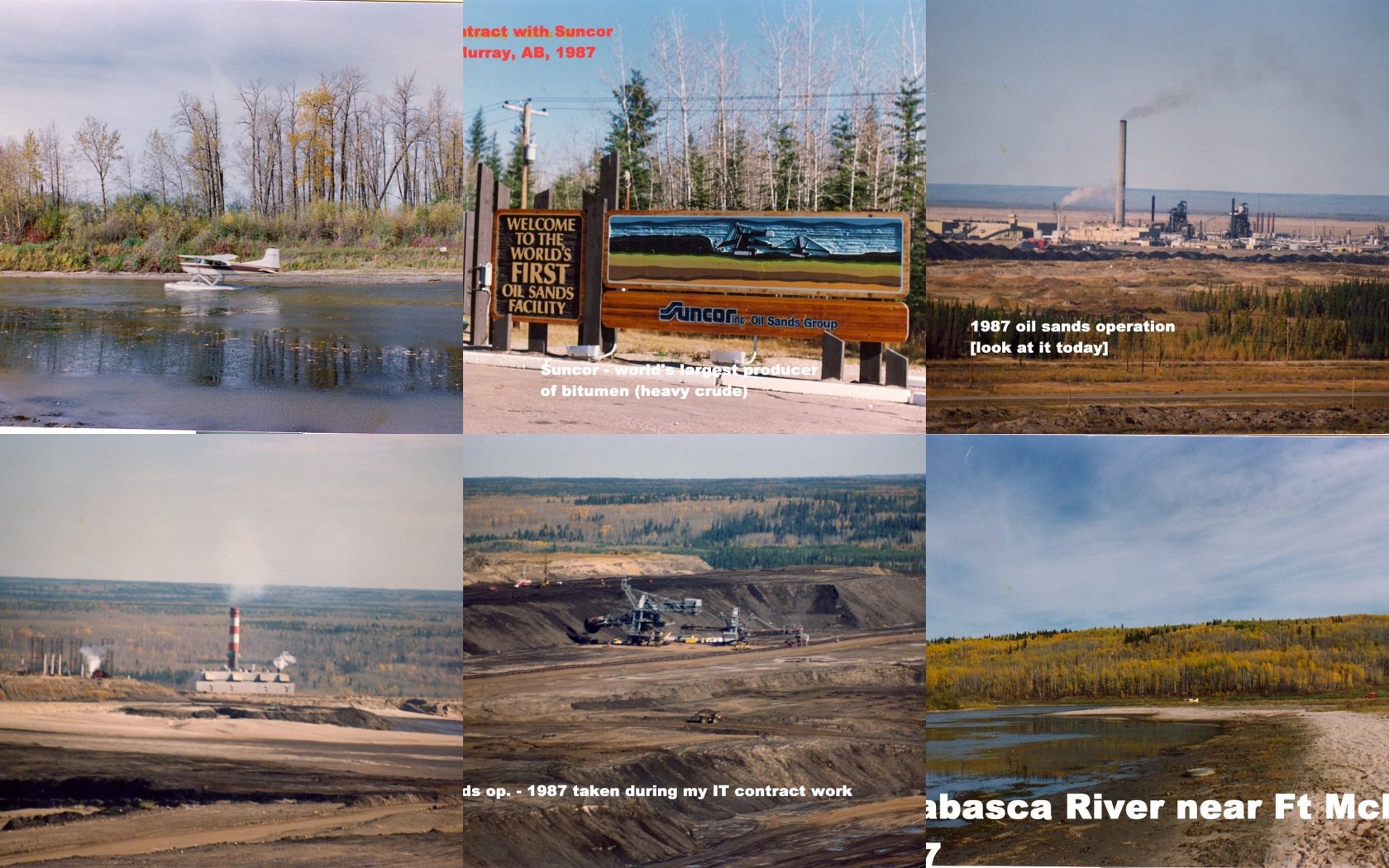 In 1987 I worked on a computer contract for SUNCOR at Fort Mac. Not very long into my contract we had an explosion in one of the buildings on site, right next to the administration building which housed the computer systems department. Environment Alberta arrived and decided that all contracts were to be cancelled and the contractors sent home. Because of PCB contamination danger. [PCB = polychlorinated biphenyls, a cancer-causing substance]. These were leaking out of old transformers. My images show Ft. MacMurray in 1987. It was a small community then. Images also show oil pollution in the rivers around it.