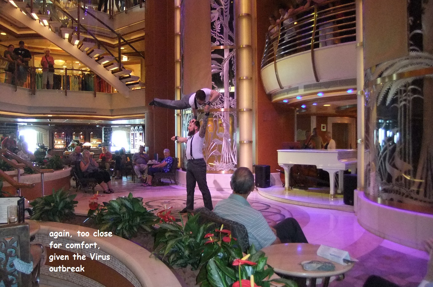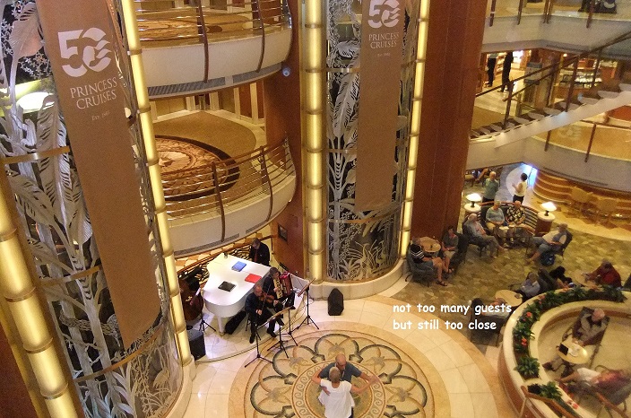 This had been a viral outbreak, possibly already arriving with the Start Princess from a previous voyage, before arriving in Vancouver. I complained officially at the Customer Services Desk, request that I like to use my balcony without being coughed at by both sides. No reaction. Throughout this voyage a large number of guests fell quite ill. Dining rooms started empty out. But entertainment went on, allowing guests to congregate in groups.